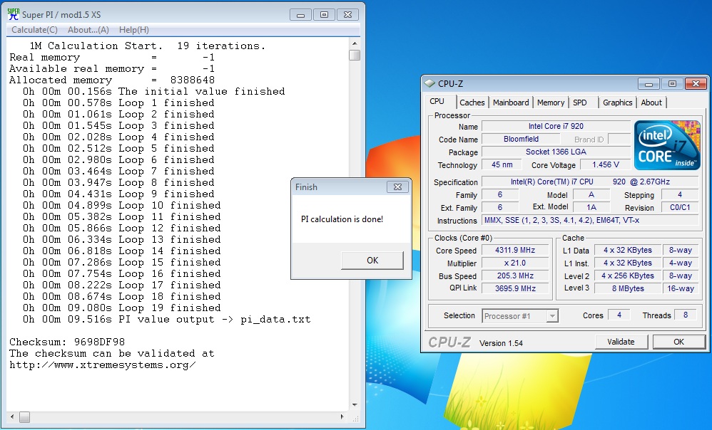 Ebbene con un voltaggio di 1,456v per la CPU siamo arrivati fino ad una frequenza di 4.311,9 Mhz con HT abilitato e siamo anche riusciti a terminare un test con il software Super Pi impostato su 1M.