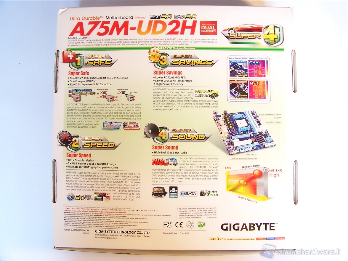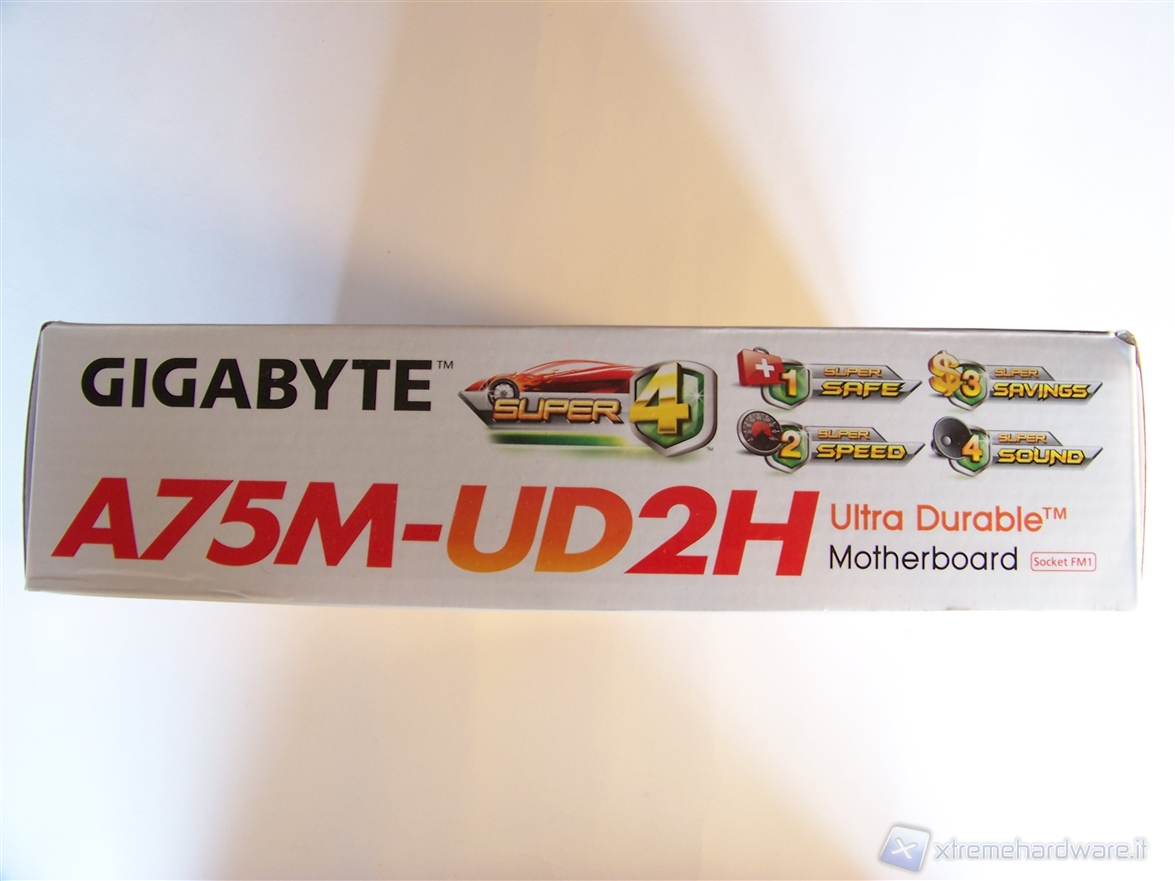 Sul retro della confezione, invece, troviamo la descrizione dei 4 punti che rendono le mainboard GIGABYTE Super4 prodotti di prima scelta; anche in questo caso tali descrizioni le possiamo trovare sul sito ufficiale o nella seconda pagina di questo articolo.