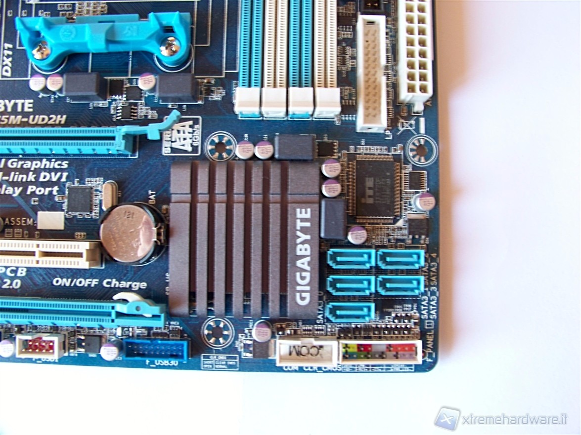 Accanto ad esso possiamo scorgere le cinque porte SATA III 6Gb/s (retro compatibili con lo standard precedente SATA II 3Gb/s), i collegamenti per il pannello frontale e la batteria del BIOS.