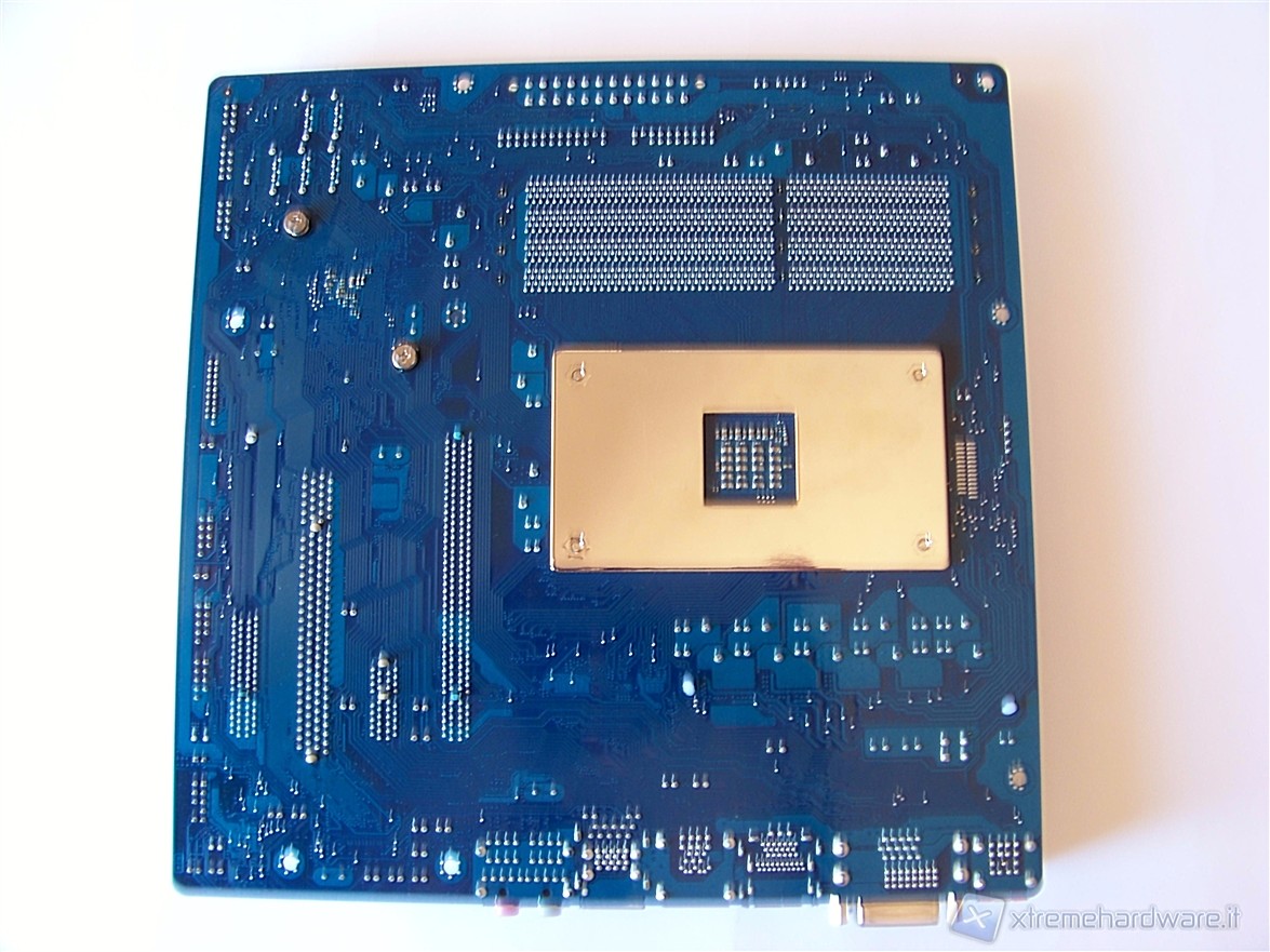 Tali staffe possono comunque essere rimosse svitando quattro viti, permettendo così l’utilizzo di un dissipatore più performante o soluzioni a liquido; notiamo in questo frangente che l’utilizzo di dissipatori dalle generose dimensioni impediscono l’alloggiamento della RAM nel primo slot disponibile. Sul retro della scheda madre troviamo il backplate collegato direttamente a tali staffe.